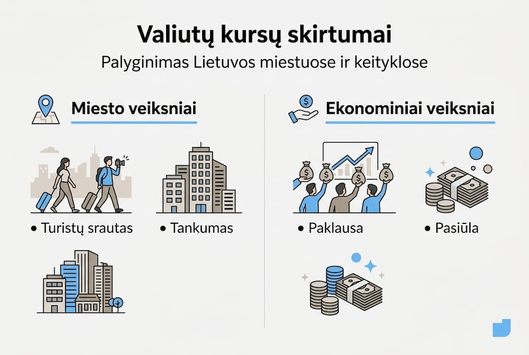 - Valiutos kursai miestuose skiriasi dėl konkurencijos ir sezono veiksnių.