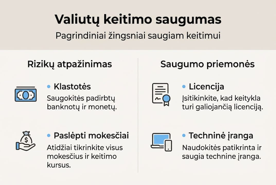 Svarbu žinoti: Lietuvos banko duomenimis, valiutų keitimo paslaugas teikiančios įmonės privalo turėti licenciją ir laikytis griežtų reikalavimų. Bet kokia keitimo veikla be licencijos yra neteisėta ir kelia didelę riziką klientui.